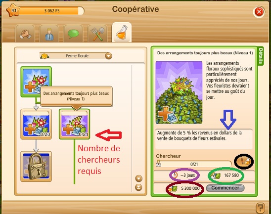 - Inscription en dollars : flèche rouge (case verte). Une seule inscription en dollars par fermier et par recherche. Il est possible d’ajouter un ou des chercheurs avec de l’or (case bleue), flèche bleue.