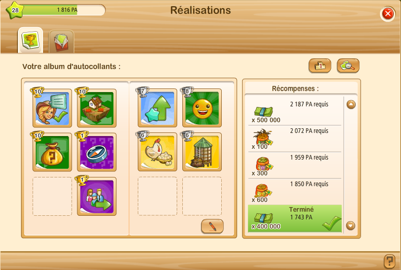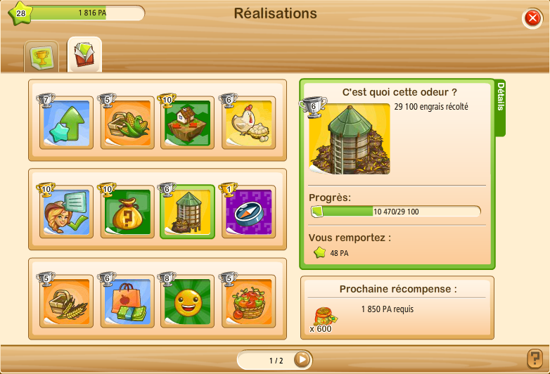 Les réalisations sont tout simplement des tâches qui nous font gagner des PA (étoiles d'expérience vertes) et au final des prix (dollars, engrais, nourritures, décos, etc). Plus de détails ci-dessous.